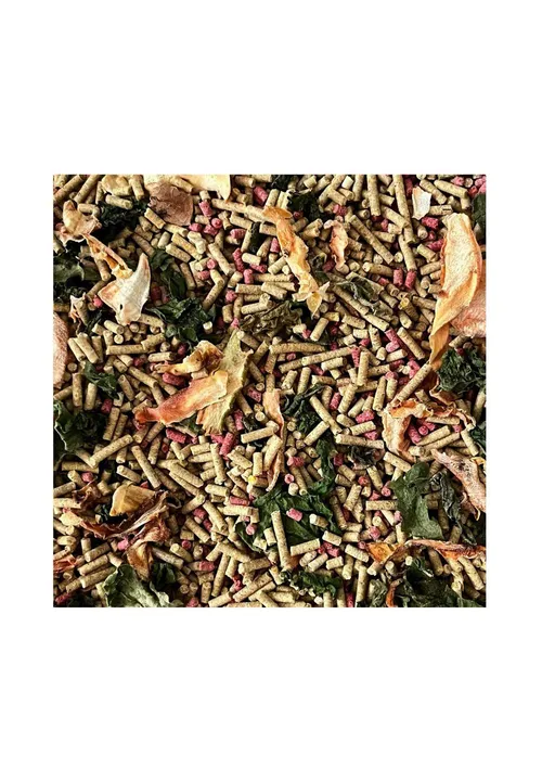 In Pellet Form: Maize, Soya, Bran, Apple Concentrate, Rooibos Leaves, Kinofos, Blanched Giant Peanuts, Zeolite, Methionine, Limestone, Vitamins